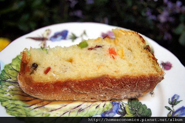 以下是用類似布里歐土司的配方做的水果麵包,鬆軟油潤,非常可口;但這不能像歐美的水果麵包那樣一擺幾個月,不但因為我們的氣候溼熱,也因為這麵包酸度不高、蜜餞少,而水份又多。