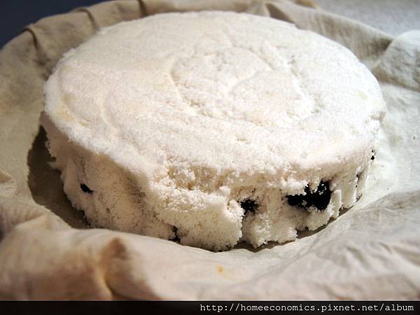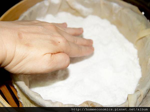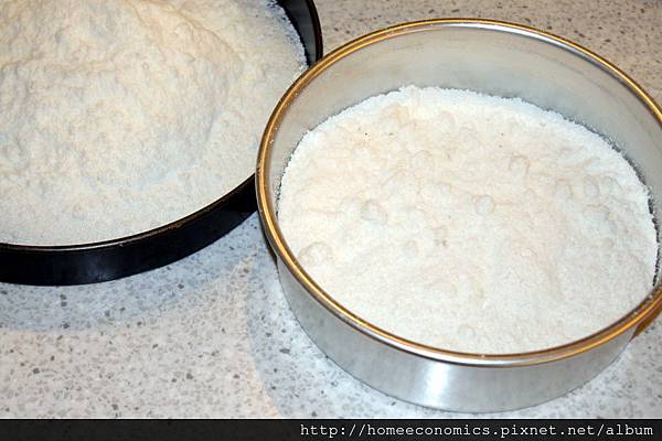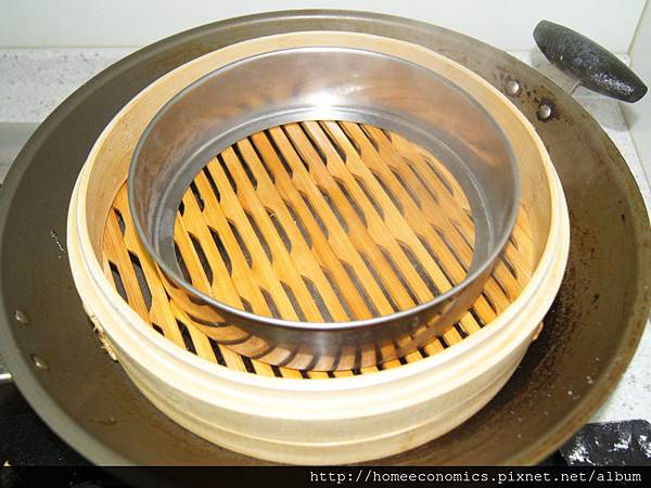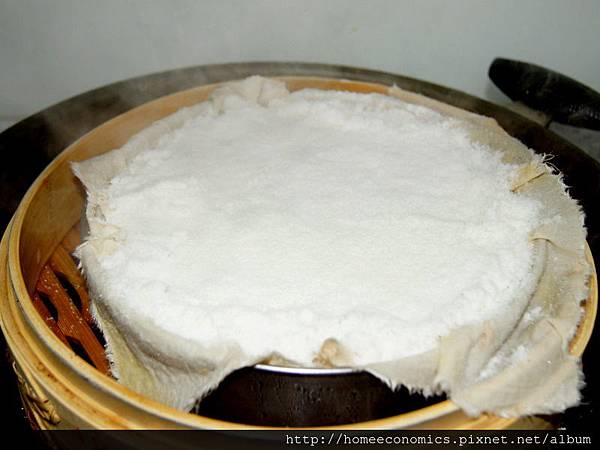 5) 一個內徑27公分的蒸籠約可蒸1斤蓬萊米粉,我的粉只剩450克,所以在蒸籠裡放個 9吋蛋糕模的邊圈,做小一點。