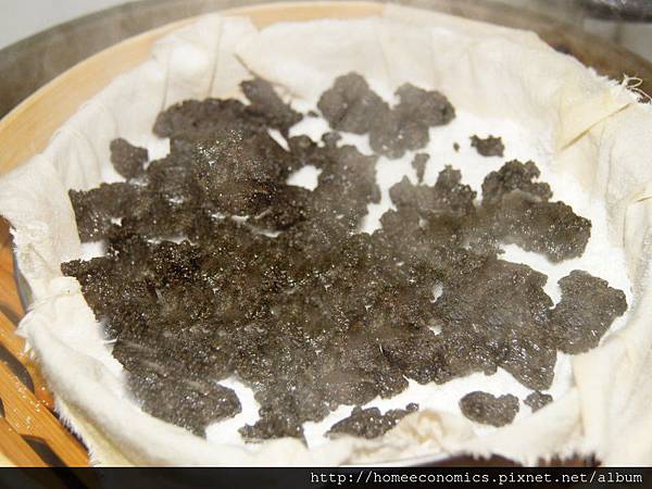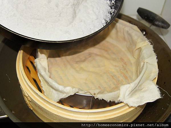 6) 把蒸籠布打溼再擰乾,鋪在蒸籠裡或蛋糕模邊圈裡。大火把蒸鍋裡的水煮沸。