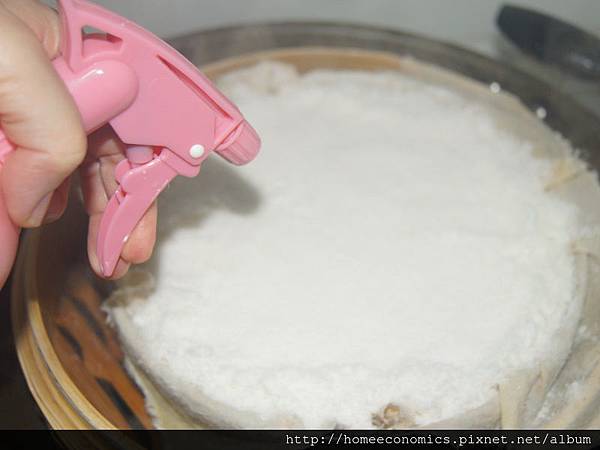 11)全加完後,輕輕刮平表面,噴些水霧。(喜歡糕體溼潤一點的人可以在蒸的過程中多噴幾次水霧)
